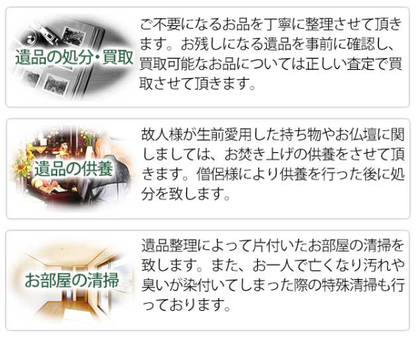 単なる不用品回収や片付け作業にとどまらず、心に残る品を一つひとつ確認し、必要に応じてご供養やリユースにも対応。