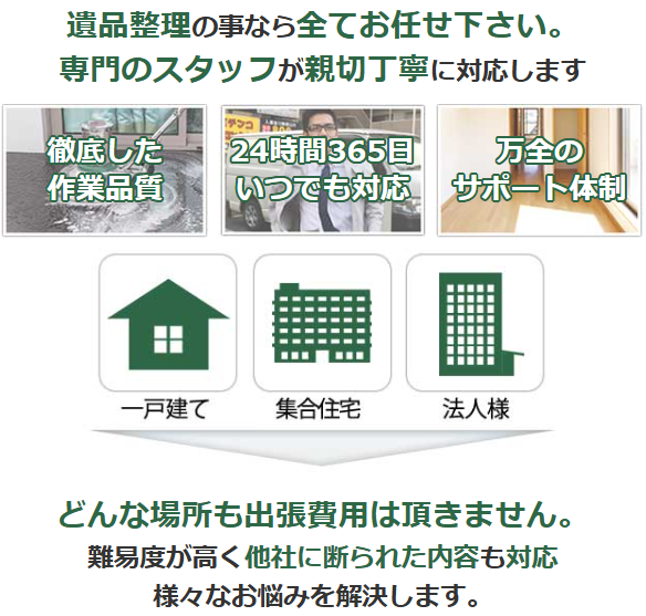 お仕事やご家庭の都合に合わせて土日祝日の作業も承っており、遠方からのご依頼や立ち会いが難しい場合でも安心です。