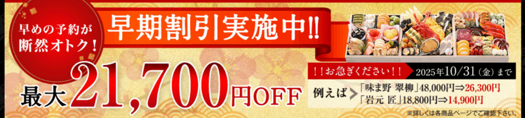 早めの予約が必須です。特に人気の料亭監修おせちは競争率が高いため注意が必要です。