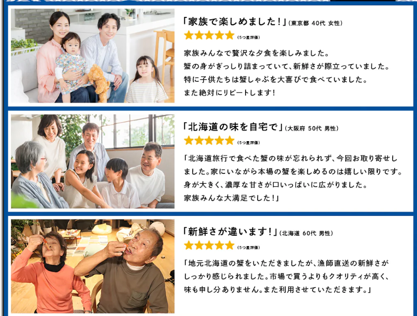 北海道や日本海など、産地直送の新鮮な蟹を取り扱っているため、地方に住んでいても現地の味をそのまま堪能できます。旅行気分を味わえるのも魅力のひとつです。